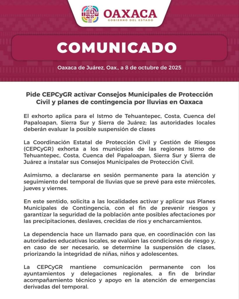 Pide CEPCYGR activar Consejos Municipales de Protección Civil y planes de contingencia por lluvias en Oaxaca.