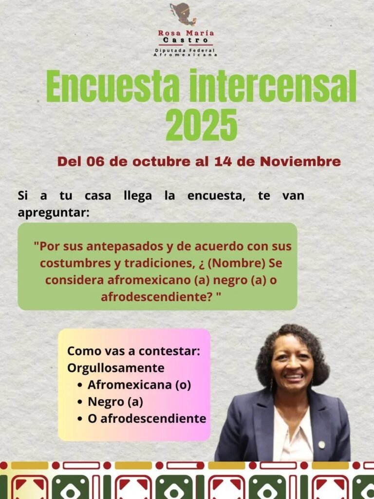 La diputada federal Rosa María Castro Salinas invita a todas y todos a participar en la Encuesta Intercensal 2025 del INEGI, que se realizará del 6 de octubre al 14 de noviembre de 2025. 🗓️📋