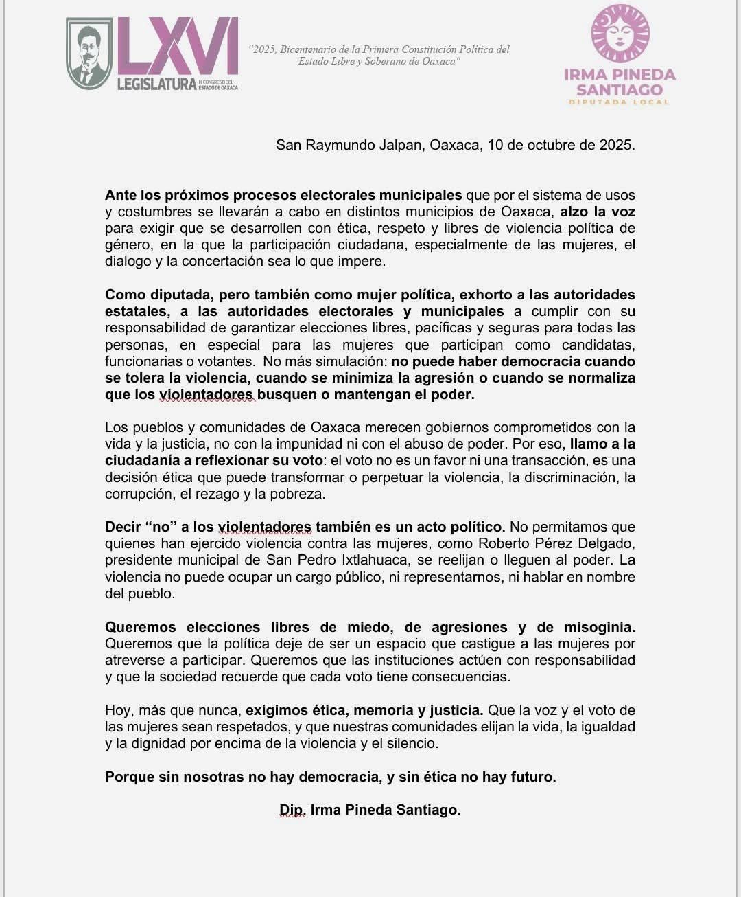 Diputada Irma Pineda exige procesos electorales municipales con ética y libres de violencia política de género en Oaxaca